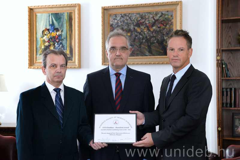 A Mellkassebészek Európai Társasága a legmegbízhatóbb együttműködő partnerének választotta a Debreceni Egyetem Klinikai Központ Sebészeti Klinika Mellkassebészeti Részlegét. Az erről szóló tanúsítványt a napokban vették át a klinika vezetői.Az elismerés igazolja, hogy Európában a Sebészeti Klinika a legmegbízhatóbb együttműködő partnere a Nemzetközi Társaságnak, megelőzve számos híres európai egyetem mellkassebészeti osztályát.