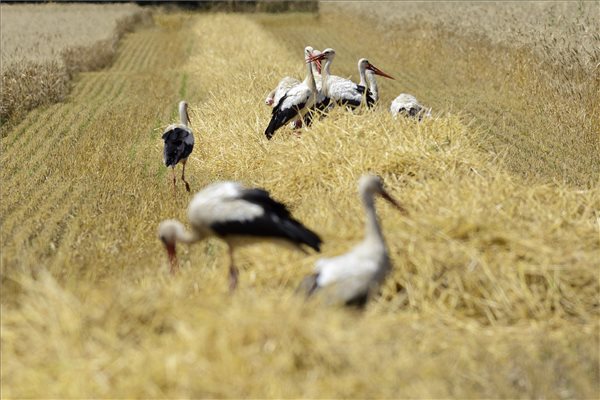 Gólyák az aratás idején egy Debrecen közeli szántóföldön 2016. június 29-én. A kedvező időjárás miatt korábban elkezdődhetett az őszi búza betakarítása. A termés várhatóan 5 tonna körüli lesz hektáronként. A hazai felhasználás mellett a tervek szerint mintegy 2 millió tonna búzát lehet exportálni. MTI Fotó: Czeglédi Zsolt