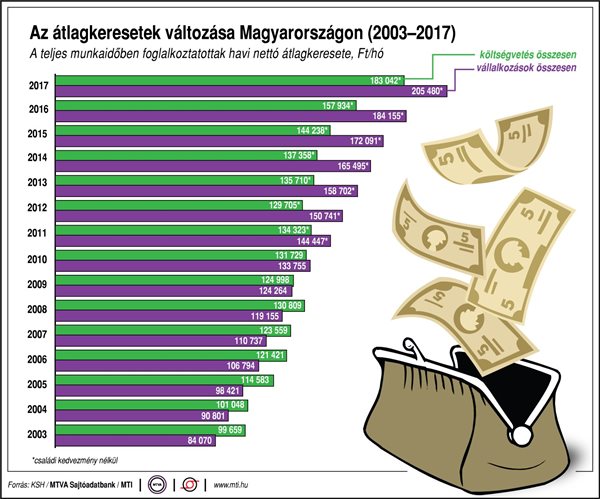 Horváth András, a Takarékbank elemzője a szakemberhiány, illetve a 8 és 12 százalékos további bérminimum-emelés hatására 9 százalékot meghaladó bérnövekedést vár az idén, ami a 2,6 százalékos éves infláció mellett 6 százalékot meghaladó reálbér növekedést jelent a tavalyi 10,3 százalék után. Számításai szerint 2013-tól 2018 végéig összesen 40 százalékkal, közfoglalkoztatottak nélkül számolva pedig 42 százalékkal nőnek a reálbérek. Mint hozzátette, felfelé mutató kockázatot jelent, hogy egyes hiányszakmákban továbbra is gyorsuló bérnövekedésre lehet számítani.
