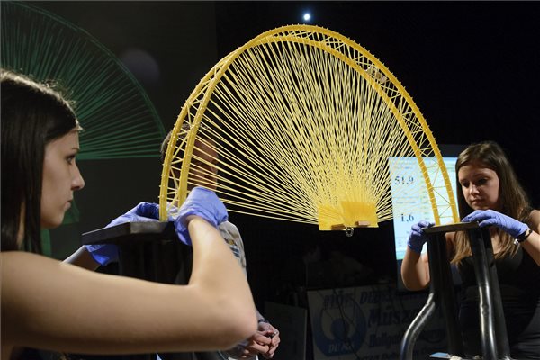 A Debreceni Egyetem Műszaki Kar Kör-Telikör nevű csapatának tagjai tésztahídjukat igazítják meg a terhelőpadon az egyetem műszaki kara által szervezett TörDElő nemzetközi tésztahídépítő versenyen a debreceni Lovarda Egyetemi Kulturális és Konferenciaközpontban 2014. október 14-én. MTI Fotó: Czeglédi Zsolt