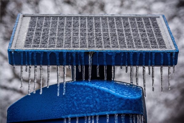 Ónos esőtől eljegesedett napelem egy parkolóautomatán Debrecenben 2015. január 3-án. Az Országos Meteorológiai Szolgálat az ónos eső veszélye miatt elsőfokú figyelmeztetést adott ki Békés, Borsod-Abaúj-Zemplén, Hajdú-Bihar, Heves, Jász-Nagykun-Szolnok és Szabolcs-Szatmár-Bereg megye területére. Emellett Borsod-Abaúj-Zemplén, Hajdú-Bihar, Heves és Szabolcs-Szatmár-Bereg megyére a havazás miatt adtak ki elsőfokú figyelmeztetést. MTI, fotó: Czeglédi Zsolt