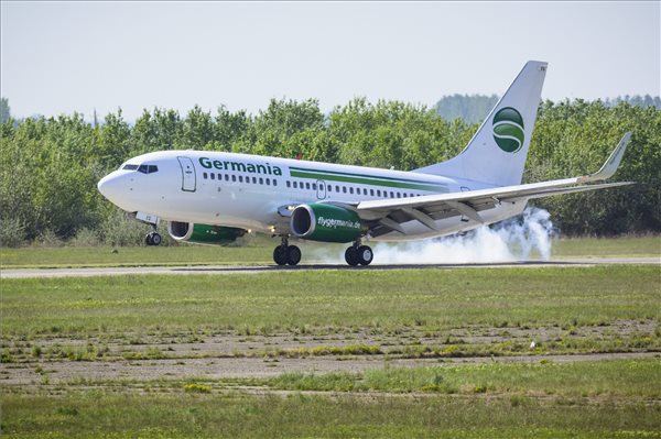 A német Germania légitársaság Boeing 737-700 típusú repülőgépe landol a Debreceni Nemzetközi Repülőtéren 2015. április 30-án.