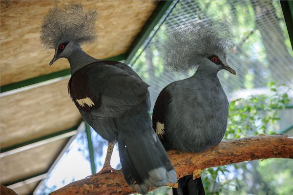 Pompás koronásgalambok, vagy más néven nyugati koronásgalambok (Goura cristata) a Debreceni Állat- és Növénykertben 2015. június 14-én. A madarak a galambvilág óriásai, mivel testhosszuk elérheti a 75 centimétert, fogságban akár 40-50 évig is élhetnek. A veszélyeztetett faj példányai az Európai Törzskönyvi Programban (ESB) érkeztek Debrecenbe. MTI Fotó: Czeglédi Zsolt