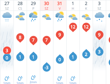 Péntekre egy gyenge hidegfront hozhat esőt, záport északnyugat felől, és ez a csapadékmező az esti órákban délkelet felé távozik is. Helyenként átmenetileg megélénkülhet az északnyugati szél. Délután 3-10 fok várható.