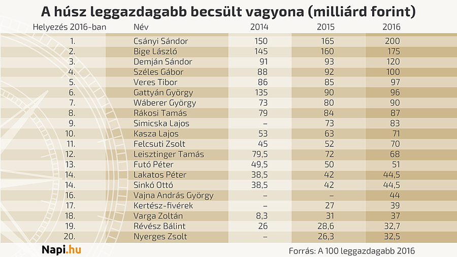 Őt Bige László, a Nitrogénművek Zrt. tulajdonosa követi 175 milliárd forinttal, míg a harmadik helyre – öt év után újra – Demján Sándor került, akinek vagyona 120 milliárd forintra nőtt.