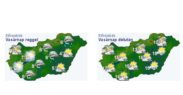 A legmagasabb nappali hőmérséklet vasárnap 12 és 19 fok között várható, az északkeleti határvidéken azonban helyenként csak 10, 11 fok valószínű.