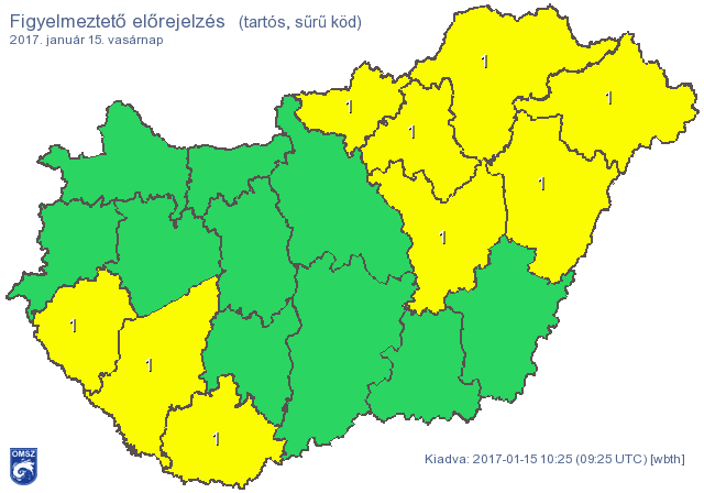Kiemelték továbbá, hogy éjszaka elsősorban az Alföldön, az Északi-középhegység térségében és a Dunántúl középső és nyugati részein nagyobb területen képződhet sűrű, zúzmarás köd. Akár hószállingózás, esetleg ónos szitálás is lehet. A tartós, sűrű köd veszélye miatt Baranya, Somogy, Zala, Hajdú-Bihar, Heves, Jász-Nagykun-Szolnok, Nógrád, Borsod-Abaúj-Zemplén és Szabolcs-Szatmár-Bereg megyére adták ki a figyelmeztetést.