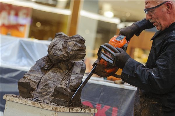 M. Tóth Zsolt jégszobrász-világbajnok egy medvefigurát farag ki láncfűrésszel egy százkilós csokoládétömbből a debreceni Fórum bevásárlóközpontban tartott csokoládéfesztiválon 2017. február 26-án. MTI Fotó: Czeglédi Zsolt