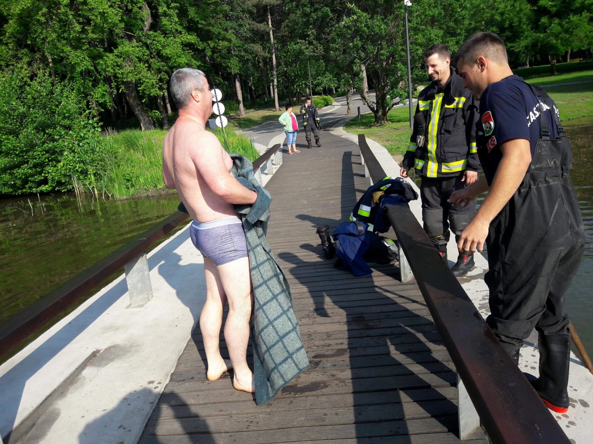 A tóban egy kacsacsalád egyik tagja a szökőkútba szorult és nem tudott kiszabadulni. Mivel a tó közepén van a szökőkút, halásznadrágban nem tudták megközelíteni az állatot, ezért az egyik önként jelentkező tűzoltó levetkőzött és beúszott a kiskacsáért.