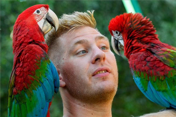 A két, még ismeretlen nemű színpompás zöldszárnyú ara papagáj két hete, július 10-én repült ki a biztonságot nyújtó odúból. Az állatgondozók által nevelt fiókák fokozott figyelmet és gondoskodást igényelnek, így a teljes önállóságukig még legalább további egy hónap szükséges. Szerencsére egészségesek és jó étvágyúak.