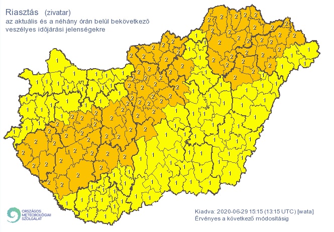 A megye északnyugati részére másodfokó (narancssárg), a többi járásra elsőfokú riasztást adtak ki a zivatarveszély miatt: