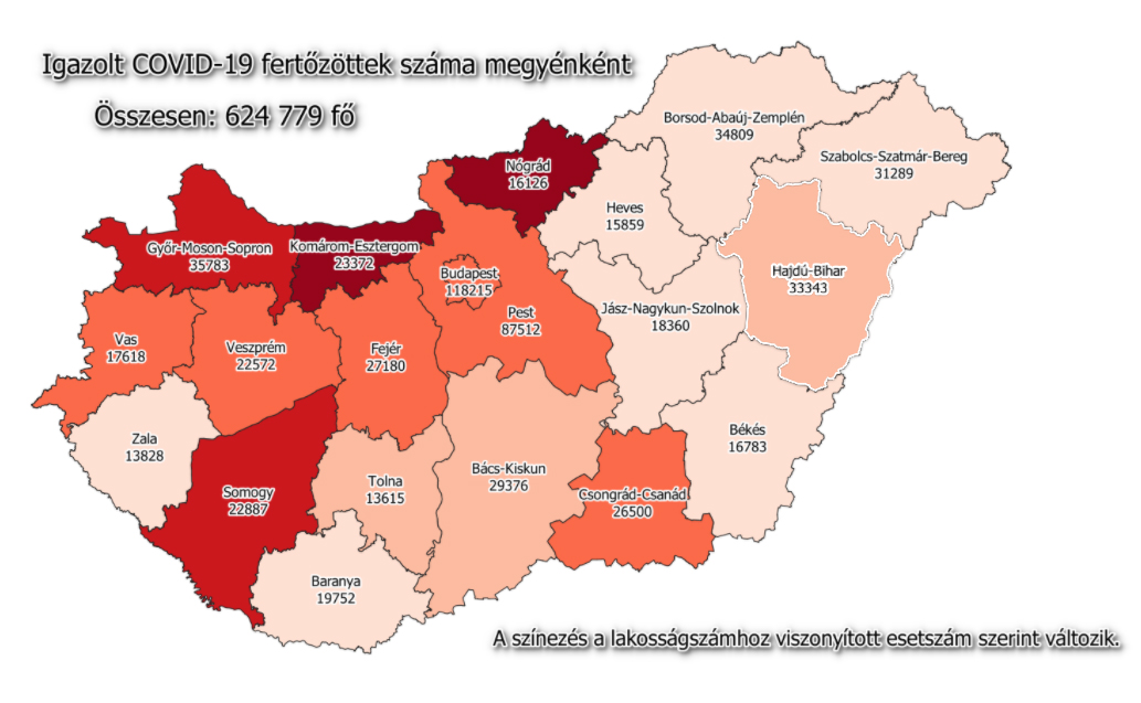 A kormányzati portálon azt írták: 624 779-re nőtt a Magyarországon azonosított fertőzöttek száma. Hajdú-Bihar mgyében 506 új esetet jelentettek. Az elhunytaké 19 752-re emelkedett, a gyógyultak száma 393 999.
