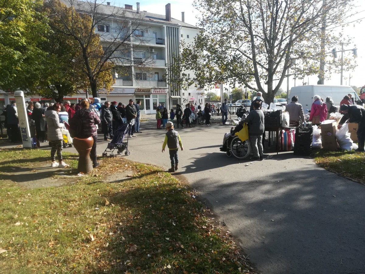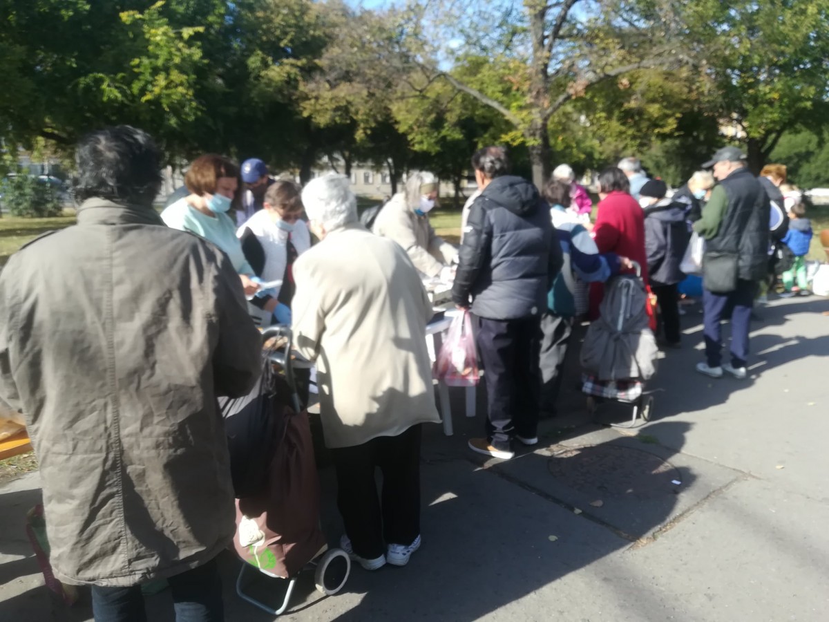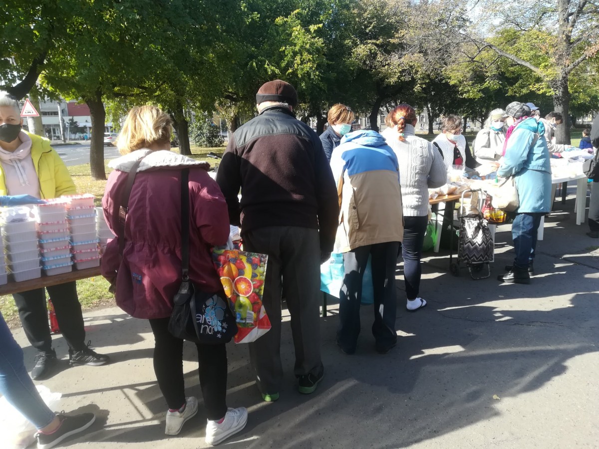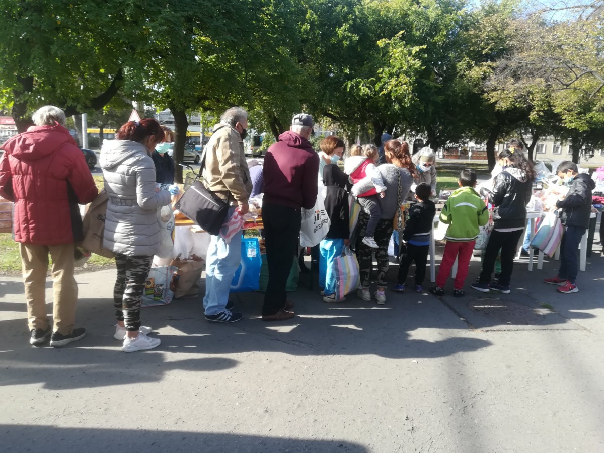 A kellemes, napos időben már a kezdés előtt másfél órával elkezdtek gyülekezni a Petőfi téren az ételre várók. Folyamatosan jöttek, többségében kisnyugdíjasok és gyermekes családok.
