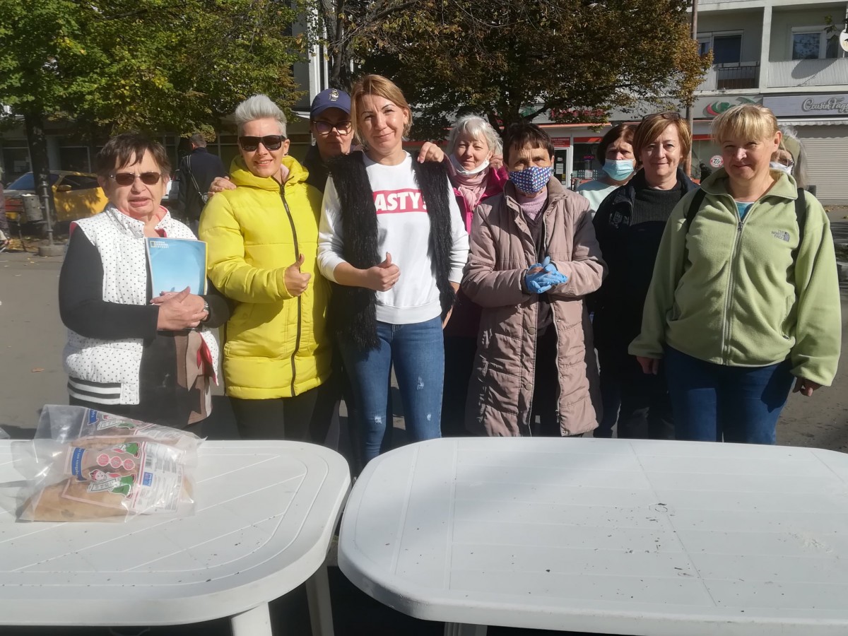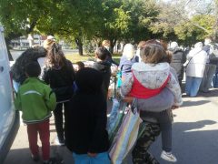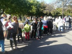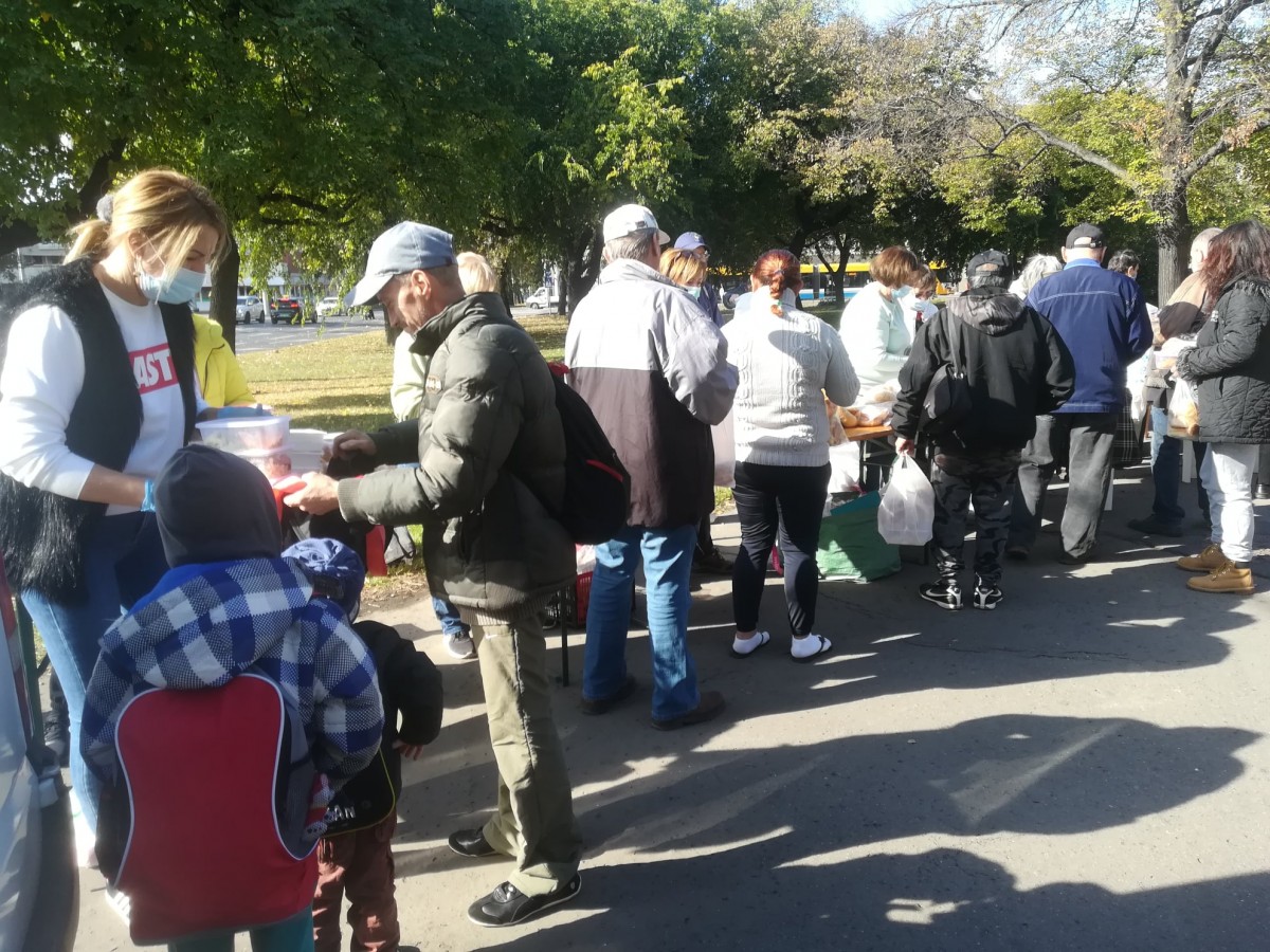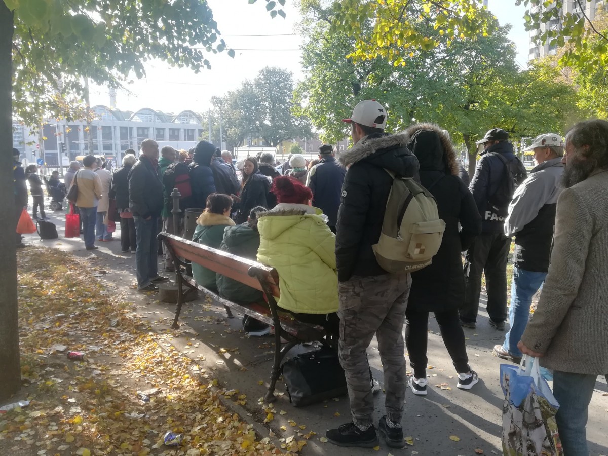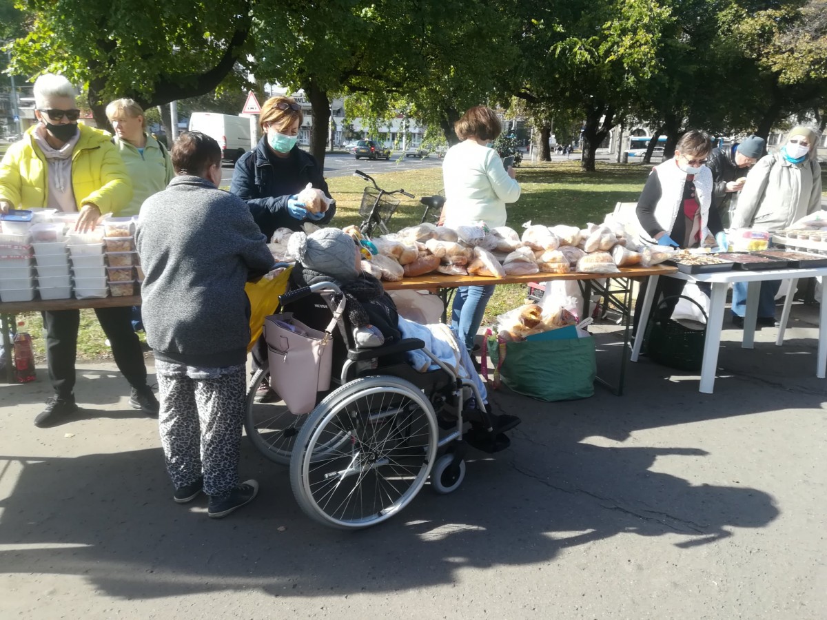 A kellemes, napos időben már a kezdés előtt másfél órával elkezdtek gyülekezni a Petőfi téren az ételre várók. Folyamatosan jöttek, többségében kisnyugdíjasok és gyermekes családok.