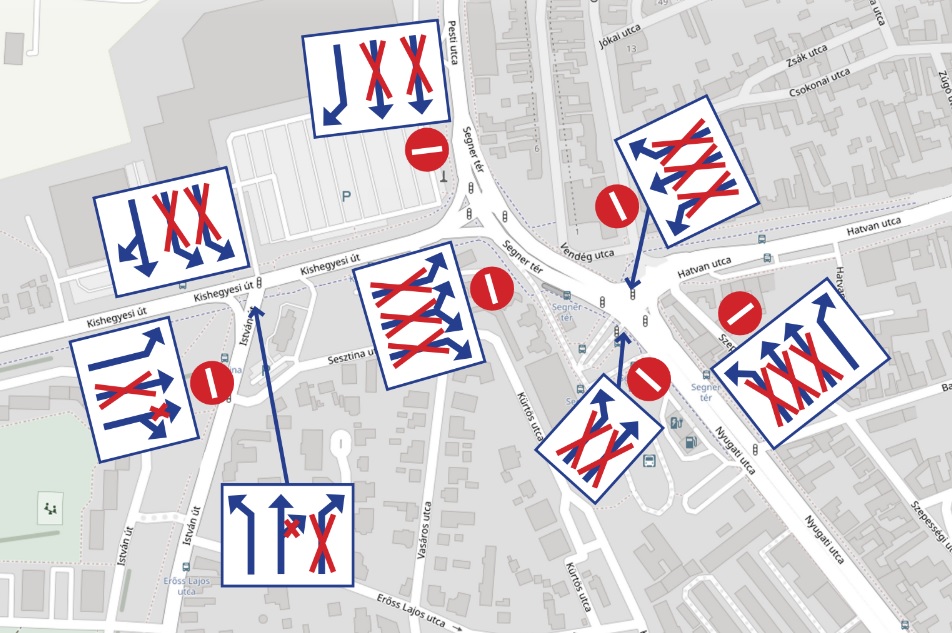 – A Pesti utca irányából a Segner térre történő egyenesen haladás tilos lesz, csak a Kishegyesi útra történő kis ívű jobbra kanyarodás engedélyezett. (Kikerülés a Mester utca – Nagy Imre utca – Tisza István utca igénybe vételével javasolt.)