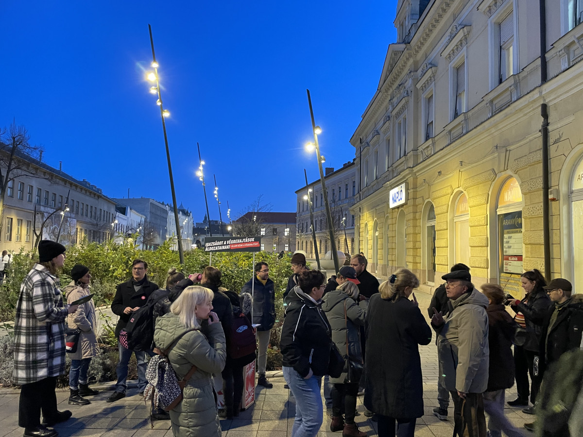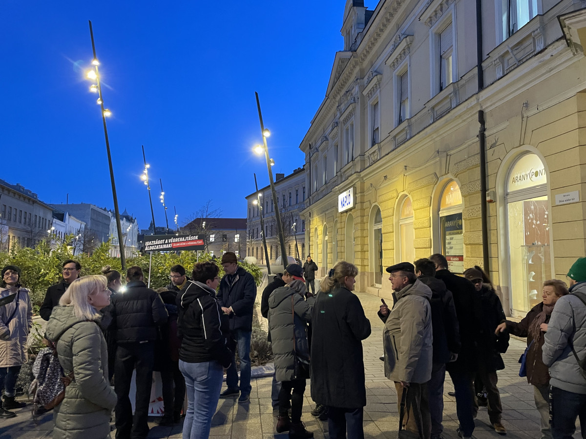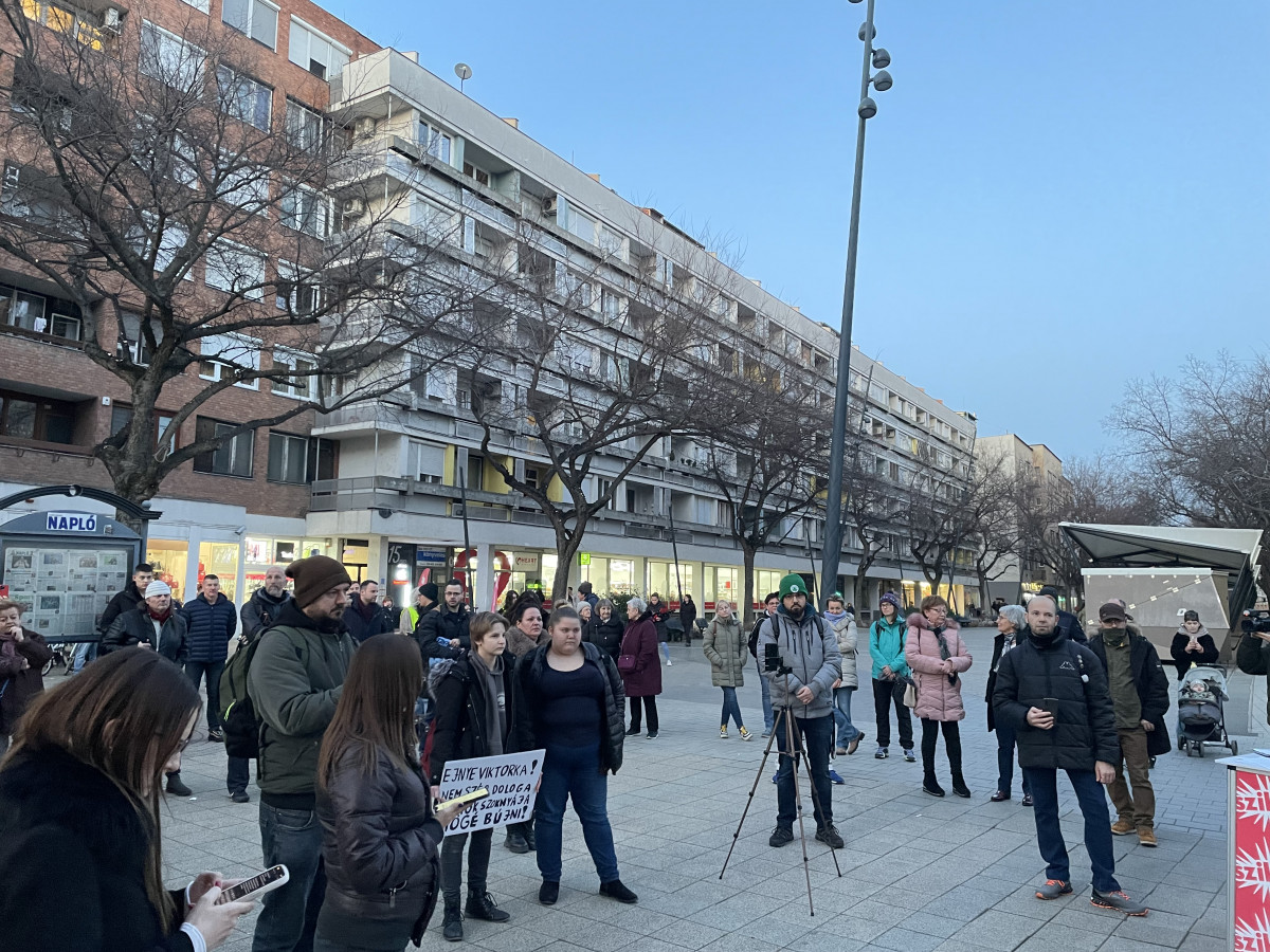 A helyszínen néhány tucat, talán 50-60 tüntető hallgatta a beszédeket. Szabó Bence és Mándi László debreceni momentumos önkormányzati képviselők arról beszéltek, hogy a bicskei pedofilbotrány kapcsán nem a lemondott Novák Katalin és Varga Judit a valódi felelősök. Azért kellett őket leváltani, mert megsértették Orbán Viktor hatalmát – mondta Szabó Bence.