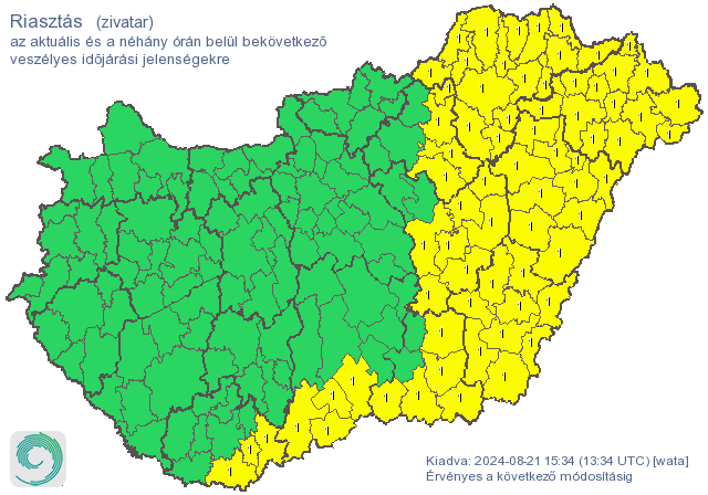 Szerdán a a déli, délutáni órákban délen, délnyugaton, majd a kora délutáni óráktól elsősorban az ország keleti harmadán fordulhatnak elő zivatarok, amelyeket viharos (~60-80 km/h) széllökések, jégeső (< 2 cm) és átmeneti intenzív csapadék (~10-25 mm) kísérhet – jelezte a HungaroMet.