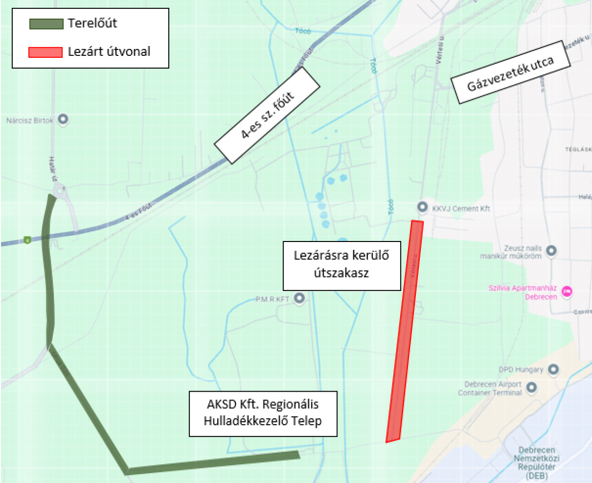 Az AKSD Kft. Regionális Hulladékkezelő Telepét, a 4-es számú főút – Szováti út – Sárga dűlő – szeméttelepi bekötőút útvonal igénybe vételével lehet megközelíteni. Az útszakasz lezárására, valamint a terelőútvonal közúti jelzőtáblákkal történő megjelölésére térképes, sárga színű útirányjelző táblák kerülnek kihelyezésre az érintett kereszteződésekben.