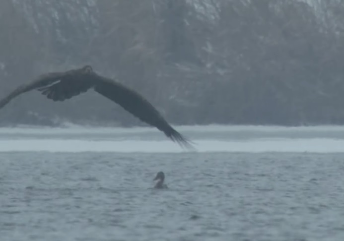 A videón két fiatal rétisas látható, ahogy megpróbál elkapni egy kacsát, sikertelenül. Sőt a két ragadozó madár előtte egy vidrára is lecsapott volna, hasonló eredménnyel.