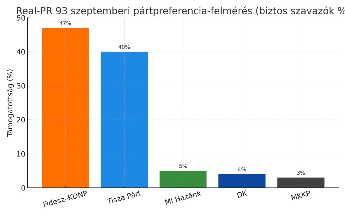 A Real-PR 93 július eleji mérésében a kormánypártok szintén 47 százalékon álltak, míg a Tisza Pártnak akkor még 42 százalékos támogatottságot mutattak ki, és egyedüli ellenzéki erőként mérték bejutónak. A mostani felmérés azonban megerősíti a Fidesz előnyét, és jelzi, hogy a Tisza gyengült az elmúlt hónapokban.
