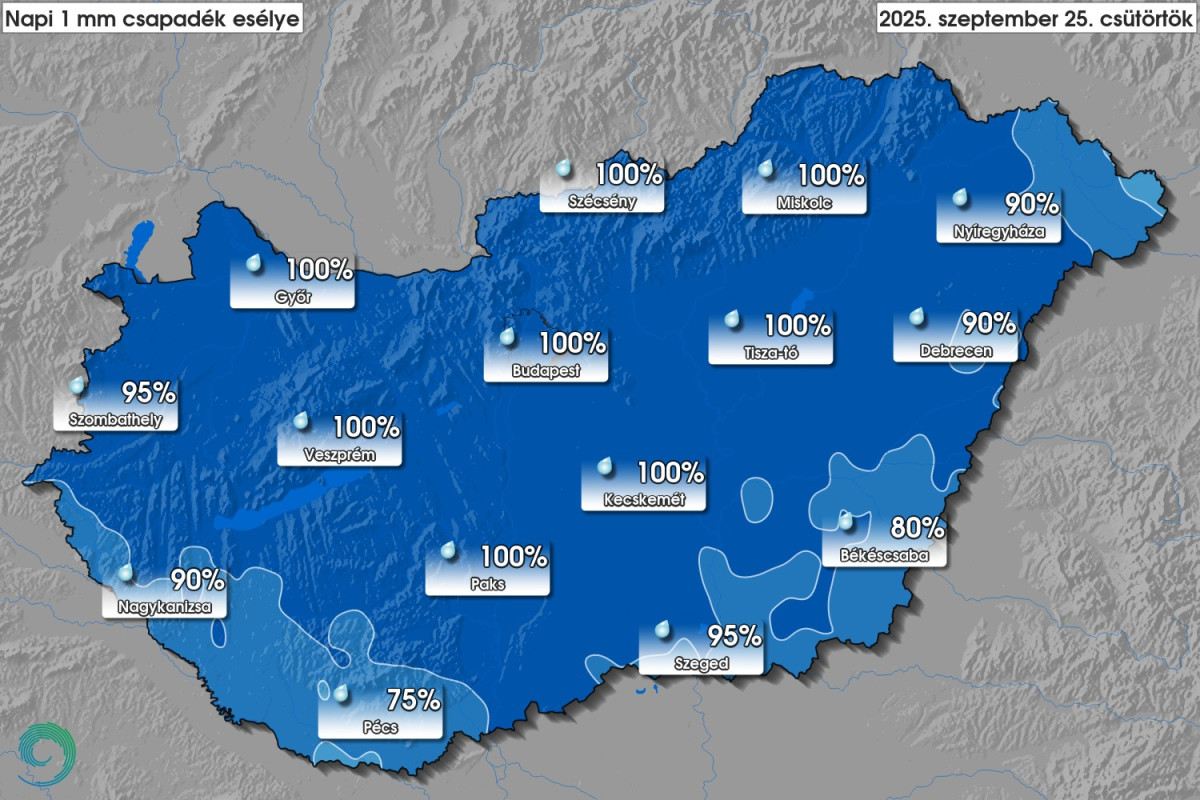 Csütörtökön folytatódik a borongós, felhős idő, de délnyugaton és nyugaton már vékonyodhat a felhőzet, és néhány órás napsütés is lehet. A csapadék fokozatosan kelet, északkelet felé húzódik. A legmagasabb hőmérséklet északon 14–19, délen 20–25 fok között várható. Lokálisan akár 10–15 mm eső is hullhat.
