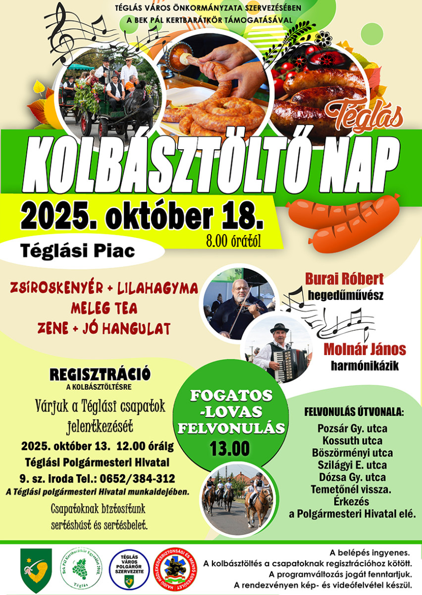 Téglás Város Önkormányzata a Bék Pál Kertbarátkör támogatásával 2025. október 18-án, szombaton rendezi meg a hagyományos Kolbásztöltő Napot a téglási piacon.