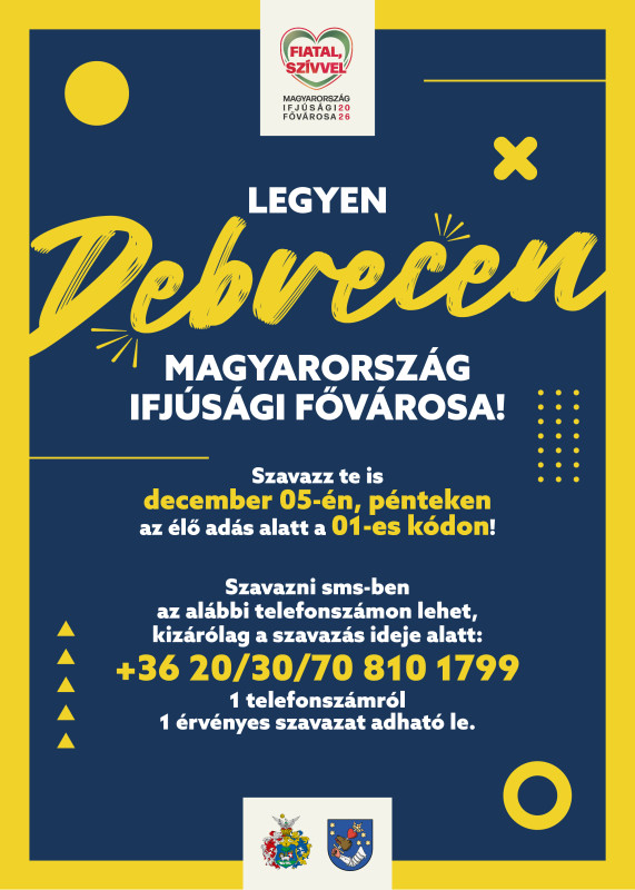 Debrecen, az iskolaváros is versenybe szállt idén, hogy elnyerje a Magyarország Ifjúsági Fővárosa 2026 címet. Az elődöntőt 2025. december 5-én rendezik Budapesten, de sms-ben leadott szavazatával bárki támogathatja a cívisvárost – írja felhívásában az önkormányzat.