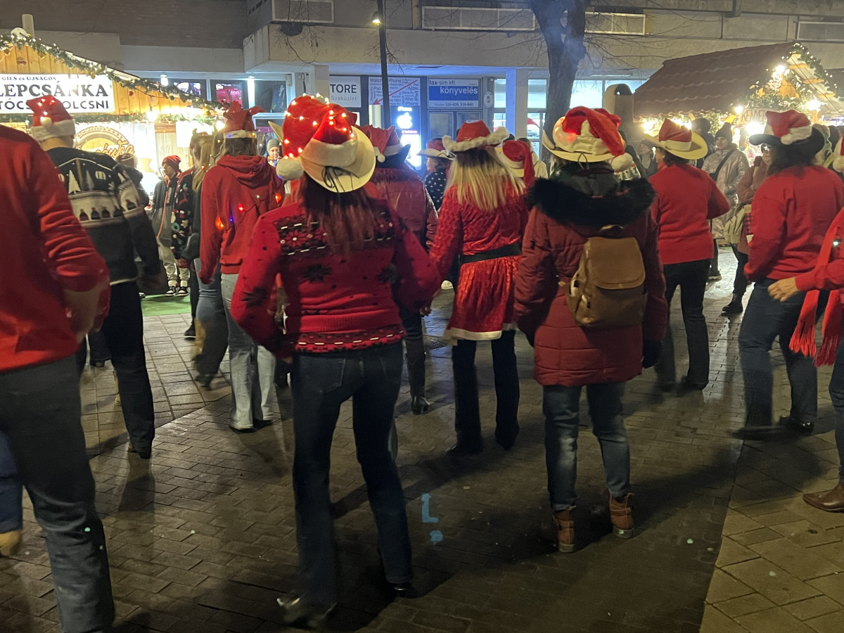 A résztvevők karácsonyi pulcsiban és színes égőkkel feldíszítve lejtették a táncukat az alkalomhoz illő klasszikus karácsonyi dalokra.
