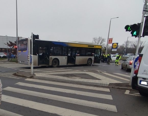 Karambolozott egy autóbusz és egy személygépkocsi Debrecenben, a Derék utcában.