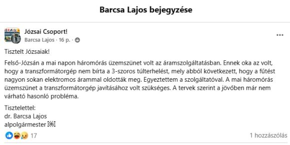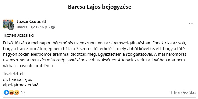 – írta a józsaiak Facebook-csoportjában Barcsa Lajos: