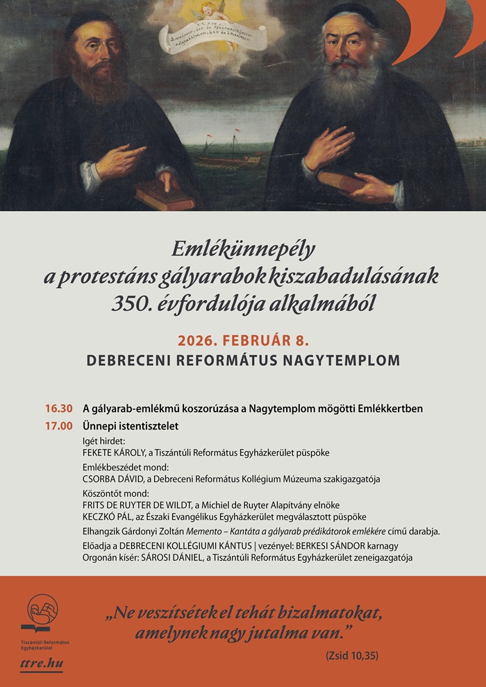 A Tiszántúli Református Egyházkerület – testvéregyházakkal együttműködve – emlékünnepélyt rendez a protestáns gályarabok kiszabadításának 350. évfordulója alkalmából 2026. február 8-án, vasárnap.