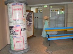 Így került az első, 1911-es villamoskocsit ábrázoló fotó mellé egy korabeli női ruha napernyővel, egy régi, “lebetonozott” hirdetőoszlop a színház egykori plakátjaival, egy ’60-as éveket idéző szobasarok, vagy egy korabeli színházi öltöző.