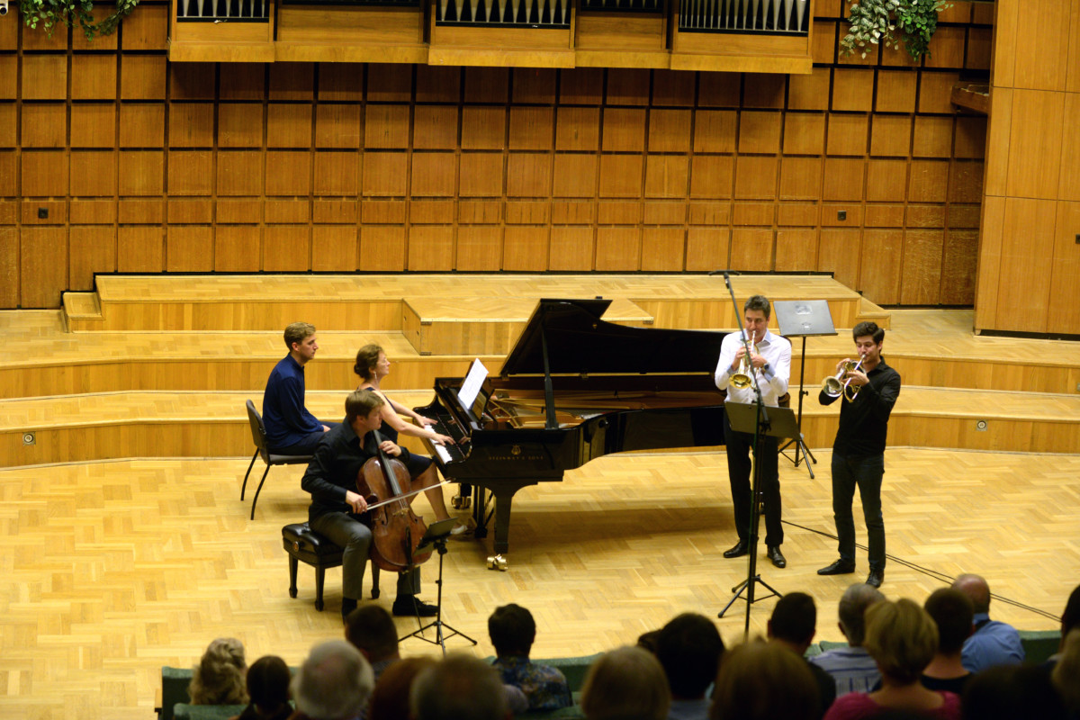 Horváth Bence és Váradi Judit előadásában hallhattuk. Ezután Dvořák Klid (Silent Woods) op.68 és Rondó for Cello and Piano műveinek finom hangulatai varázsolták el a hallgatókat. A koncert zárása igazi kamarazene volt Vivaldi g-moll kettősversenyének két trombitával, gordonkával és zongorával történő előadásával. A virtuóz játékot és a szép hangszíneket nagy vastapssal értékelte a közönség.