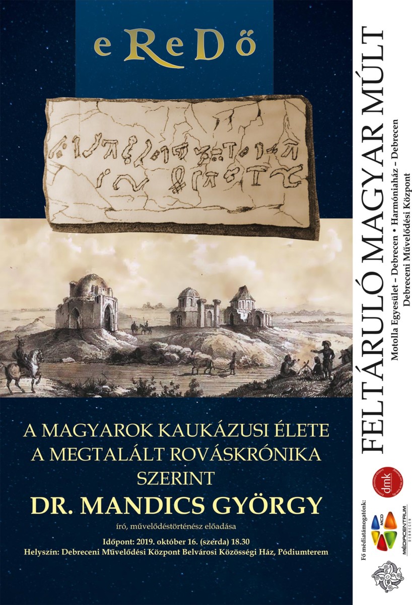 Dr. Mandics György – májusi előadásának gondolatait folytatva – a rovásbejegyzéses kódexekből kirajzolódó történelemképről fog beszélni, mely rárímel többek között a Kaukázusi Magyarországról, így a Kuma partján fekvő egykori Madzsar városáról fennmaradt emlékanyagra is, számos további kérdést felvetve.