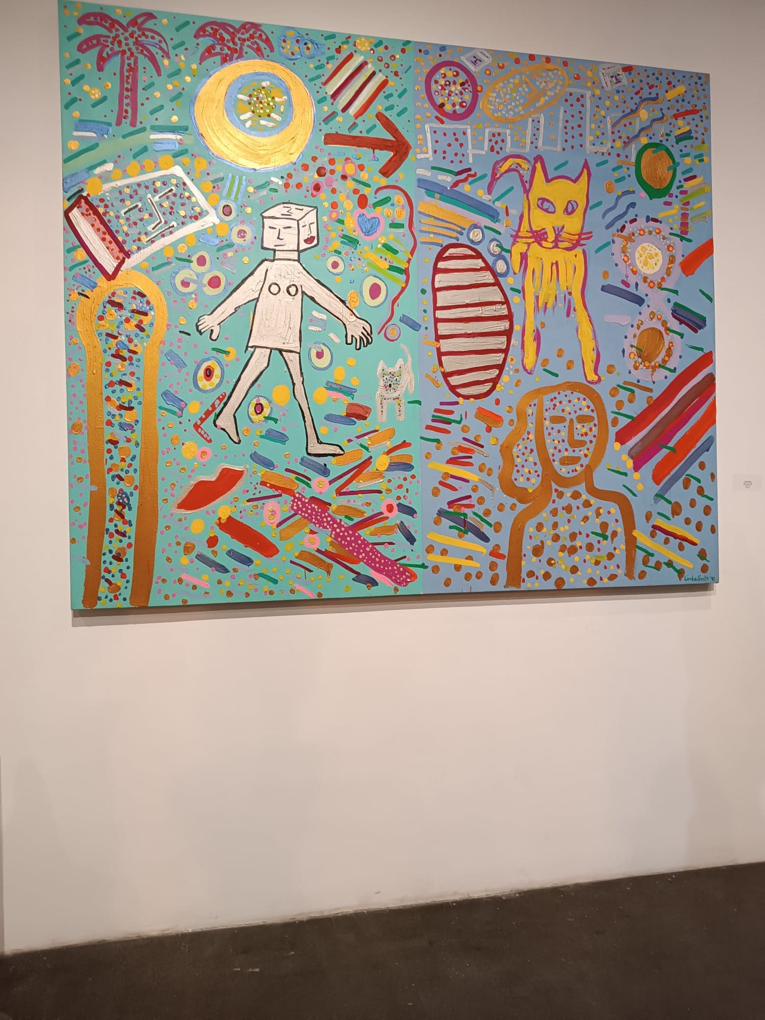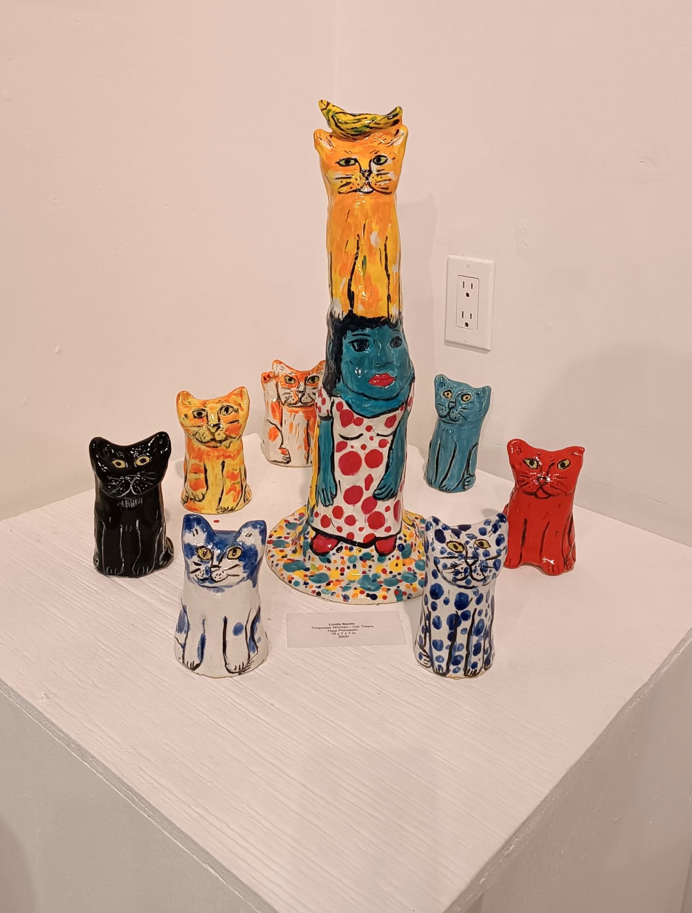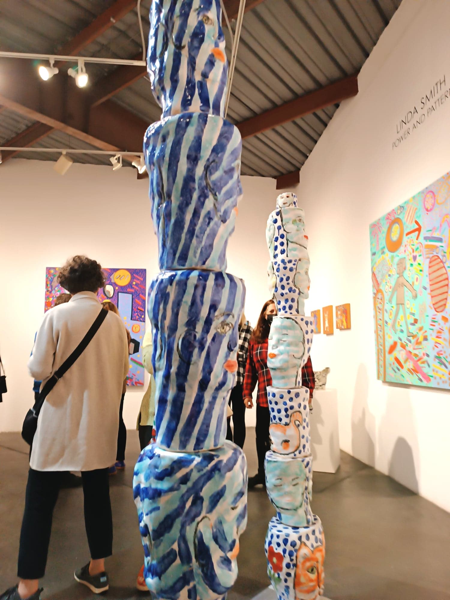 “Az élénk színek elragadó zűrzavaraként” jellemezte a 2019-ben elhunyt műkritikus, Peter Selz Linda Smith művészetét. Az alkotó 1978-tól kezdte festeni a a vibráló színű, figuratív alkotásait, amelyet humanoid pop-artnak is nevezhetünk. Későbbi korszakában áttért a kerámiákra, ahol tovább vitte a figuratív ábrázolást és megtartotta a bátor, élénk színhasználatot. A naív, emberi ábrázolás mellé belépett még egy témát – a macskák festése és és három dimenziós megalkotása szinte minden alkotásban jelen van ebből a korszakból. Méretes totemoszlopain sokszor keveredik e két téma, az emberi és állati fejek egymás alatti-feletti hierarchikus viszonya egyszerre játékos és egyszerre borzongató látvány. A sok alapszín használata, a komplementer színek egymás mellettisége folyamatos dinamikát ad a sokszor fallikus formába rendezett kompozícióknak.