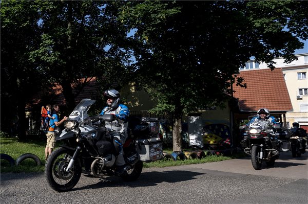 Pribil Sándor Zoltán (b) és Major János motorosok A világ csodálatos, de hazánk az otthonunk elnevezésű világkörüli motoros túrájuk indulásakor Dunaújvárosban 2018. június 1-jén.