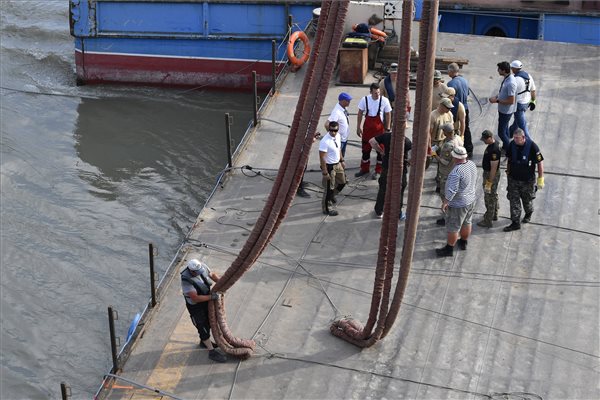 Kedd hajnalban 5 órakor kezdik a Hableány roncsának kiemelését a Dunából – jelentette be hétfő este az M1-en a Terrorelhárítási Központ (TEK) társadalmi kapcsolatokért felelős osztályának vezetője, Jasenszky Nándor. A művelet akár több óráig is eltarthat.A balesetben elsüllyedt Hableány turistahajó kiemelését készítik elő a Clark Ádám úszódaru segítségével a Margit hídnál horgonyzó uszályokon 2019. június 10-én. A Hableány május 29-én süllyedt el a Margit hídnál, miután összeütközött a Viking Sigyn szállodahajóval. A fedélzeten 35-en utaztak, 33 dél-koreai állampolgár és a kéttagú magyar személyzet. Hét embert sikerült kimenteni, hét dél-koreai állampolgár holttestét pedig még aznap megtalálták. Azóta további tizenhárom áldozat, köztük a Hableány matrózának holttestét találták meg és azonosították. MTI/Máthé Zoltán