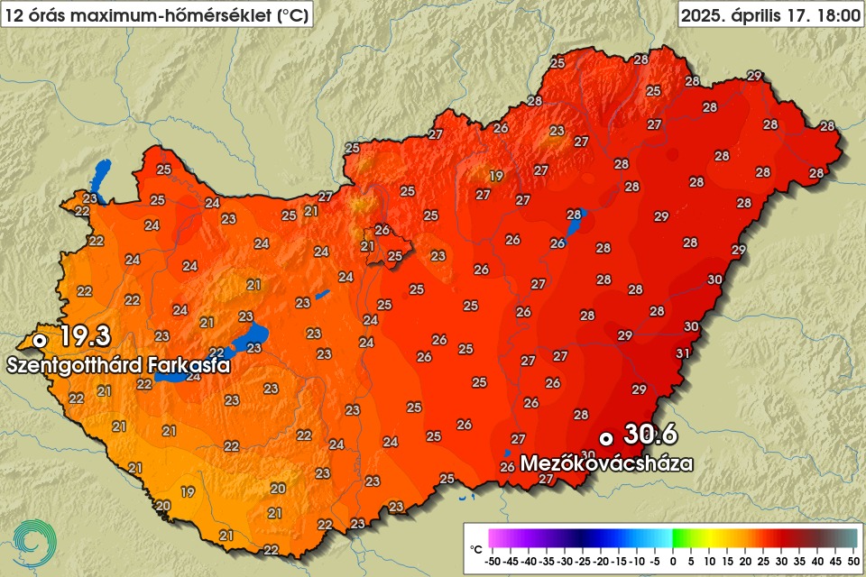 Hozzátették: idén először emelkedett 30 fok fölé a hőmérséklet csütörtökön, Mezőkovácsházán ugyanis 30,6 fokot mértek, ezzel pedig megdőlt az erre a napra vonatkozó legmagasabb maximum-hőmérséklet országos rekordja. A korábbi csúcstartó Kaposvár volt, ott 1947-ben 29,6 fok volt a napi maximum-hőmérséklet.