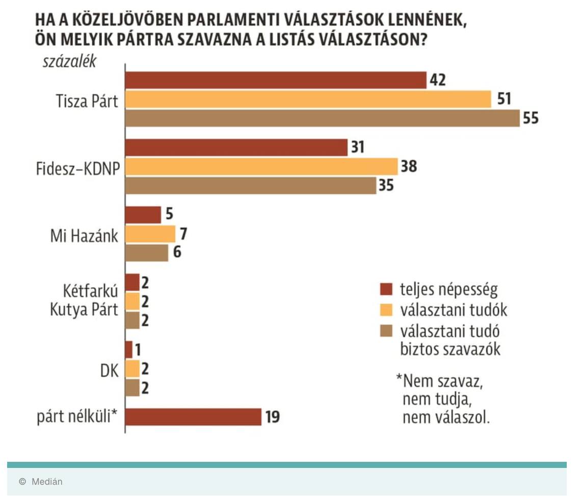 A HVG megbízásából készült friss Medián-felmérés szerint a teljes népességben 11 százalékpontos a különbség (42–31). Az eltérés oka a részvételi hajlandóság különbsége: a Tisza támogatóinak 97 százaléka biztosan elmenne szavazni, míg a Fidesz-szimpatizánsoknál ez az arány 85 százalék.