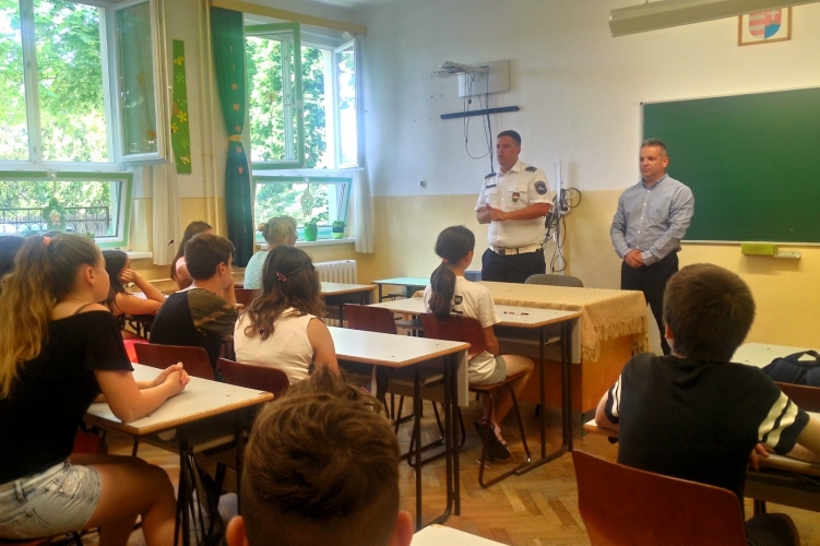 Suba István rendőr százados a legfontosabb közlekedési szabályokról, a kerékpárok kötelező tartozékairól, továbbá a biztonságos fürdőzéssel kapcsolatos tudnivalókról tájékoztatta a diákokat. Bak István rendőr alezredes a fiatalok által elkövetett leggyakoribb bűncselekményeket, az áldozattá valamint a bűnelkövetővé válás elkerülési lehetőségeit ismertette, valamint a diákcsíny és a bűncselekmény közötti különbségre hívta fel a figyelmet. Az interaktív előadás keretében a szakemberek megválaszolták a diákok kérdéseit.