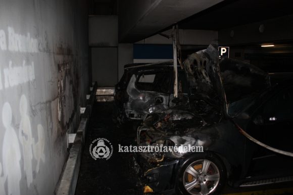 Bevásárlóközpont első emeleti parkolójában gyulladt ki egy személyautó motortere pénteken kora este. A tűz átterjedt egy másik autóra is.
