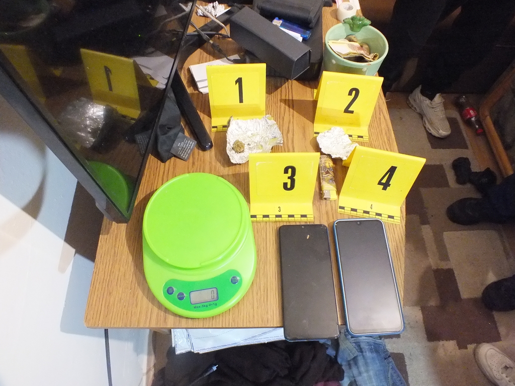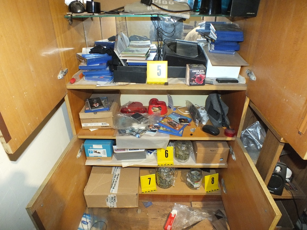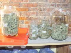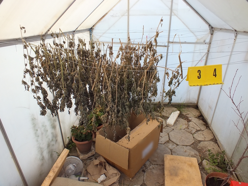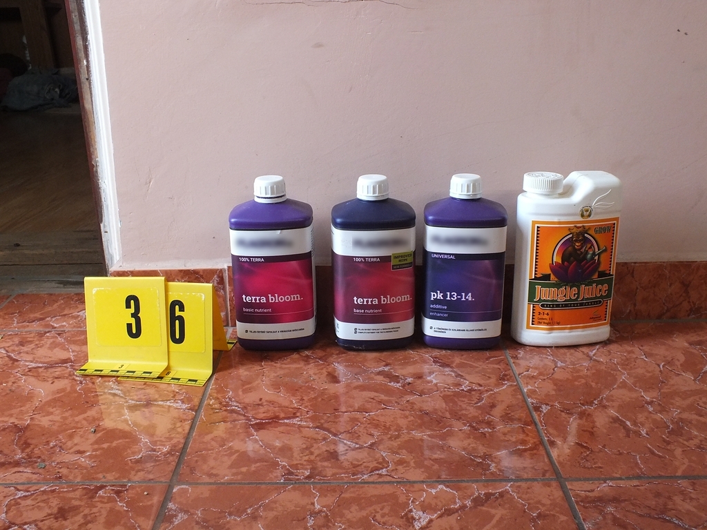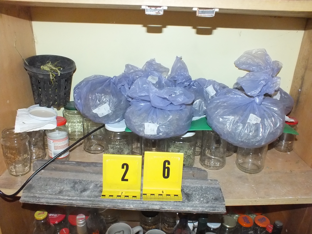 A nyomozók a kutatás során a szobákban és egy pincébe rejtve közel 2,5 kilogramm kábítószergyanús anyagot, a termesztéshez és a terjesztéshez szükséges eszközöket találtak, valamint több százezer forint készpénzt is lefoglaltak. Egy fóliasátorban, ruhaszárító kötélre felfűzve droggyanús növényi származékok és ezeken kívül kilenc tő cannabis is előkerült.