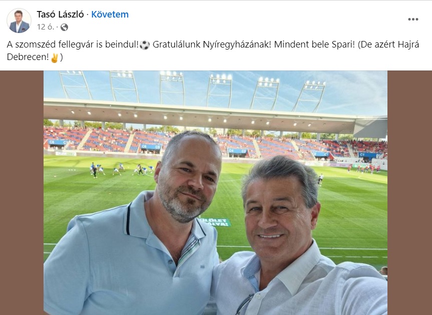 Választása a szomszédvárra, a Loki ősi riválisára esett. Tasó László a Nyíregyháza Spartacus FC új, 13,8-ról 17,5 milliárd forintra drágult, jókora késéssel elkészült stadionjában gratulált ki tudja, mihez a klubelnöknek és a polgármesternek. Ki másnak, ugye.