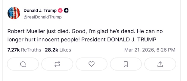 A halálhírre reagálva a magyar választási kampányba is beleokoskodó Donald Trump a Truth Socialön ezt írta: “Robert Mueller most halt meg. Jó, örülök, hogy meghalt. Többé nem árthat ártatlan embereknek!”