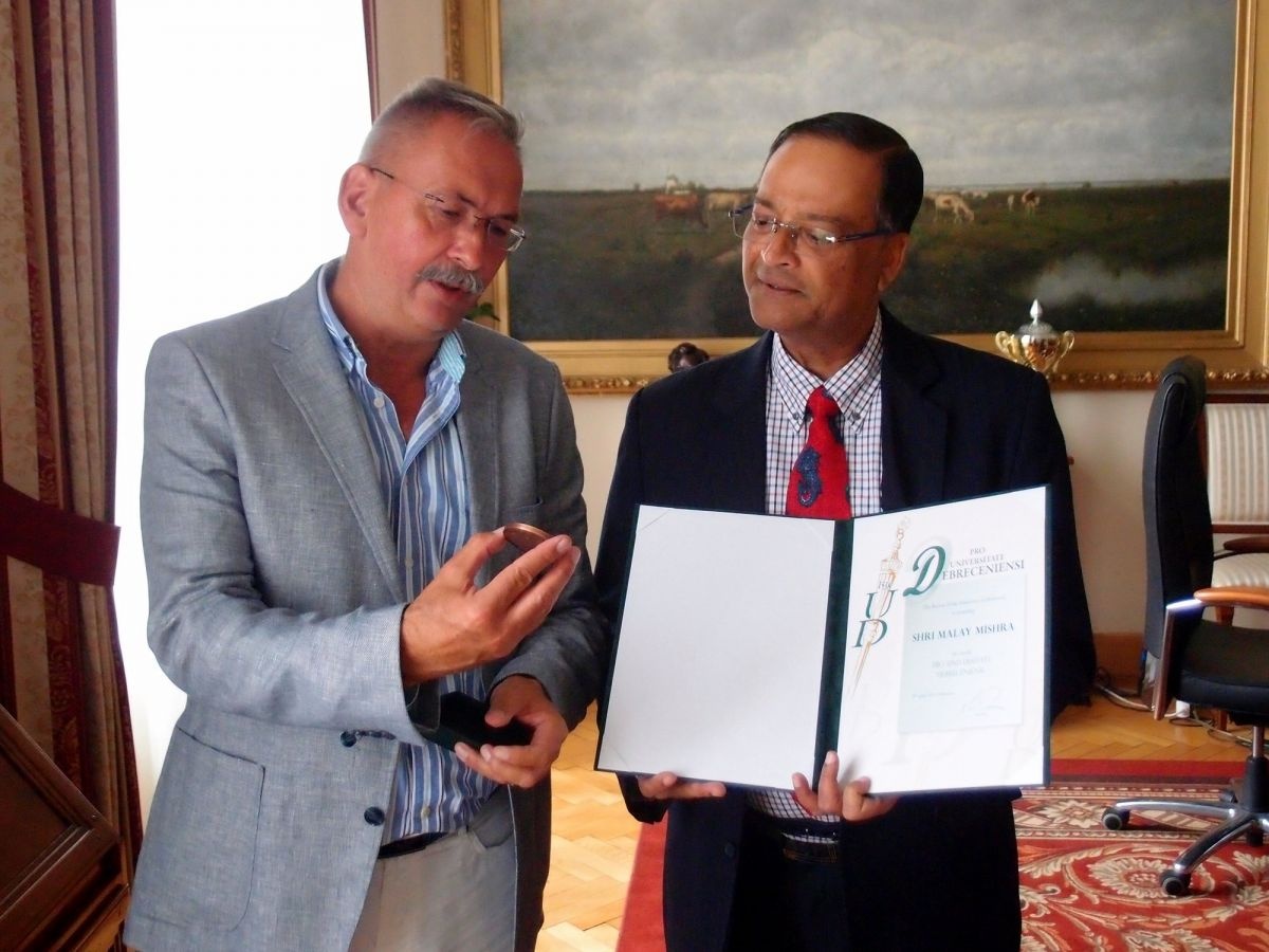 „Pro Universitate Debreceniensi 2000” emlékérmet adományozott az egyetem rektora Shri Malay Mishra, India leköszönő magyarországi nagykövetének.