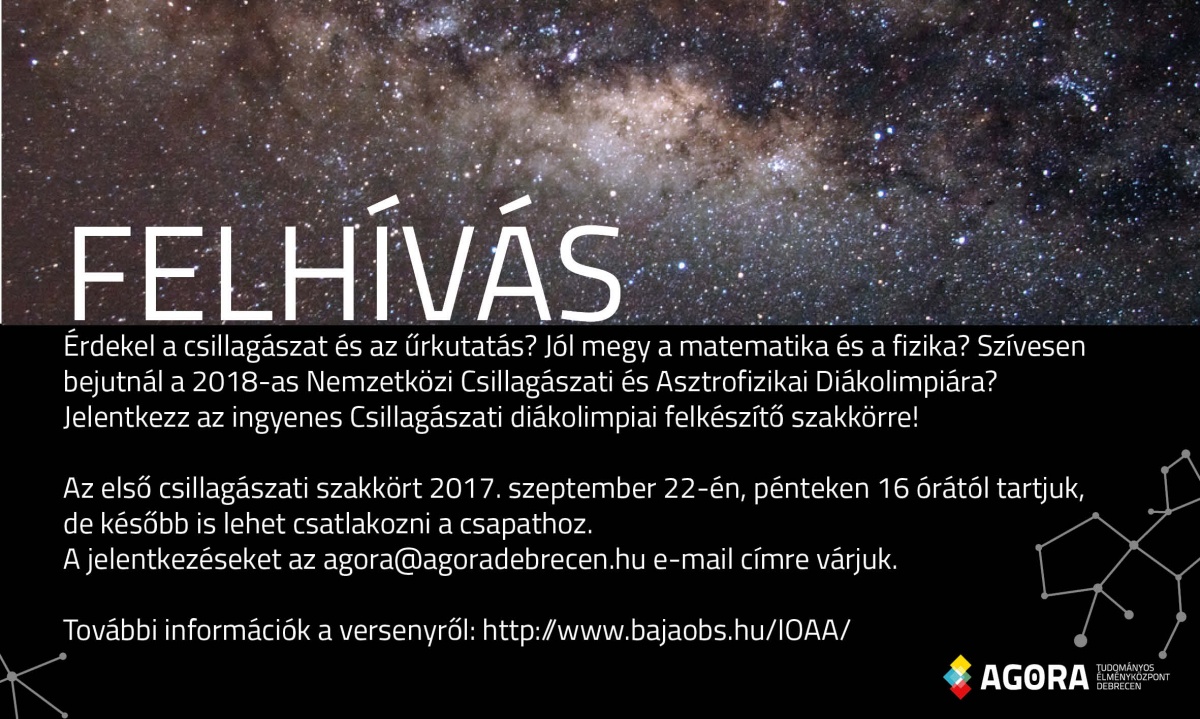 Az Agóra Tudományos Élményközpont a magyar csillagászati diákolimpiai munkacsoporttal együttműködve ismét indít a nemzeti csillagászati-űrfizikai versenyre felkészítő szakkört, a matematika és fizika terén tehetséges, a csillagászat és az űrkutatás iránt érdeklődő középiskolás diákok számára. A verseny három selejtezőfordulóból áll, a tavaszi országos döntőbe kerülő és ott a legjobb teljesítményt nyújtó fiatalok alkotják majd a magyar olimpiai keretet, akik azután megkezdik felkészülésüket a 2018-as Nemzetközi Csillagászati és Asztrofizikai Diákolimpiára.