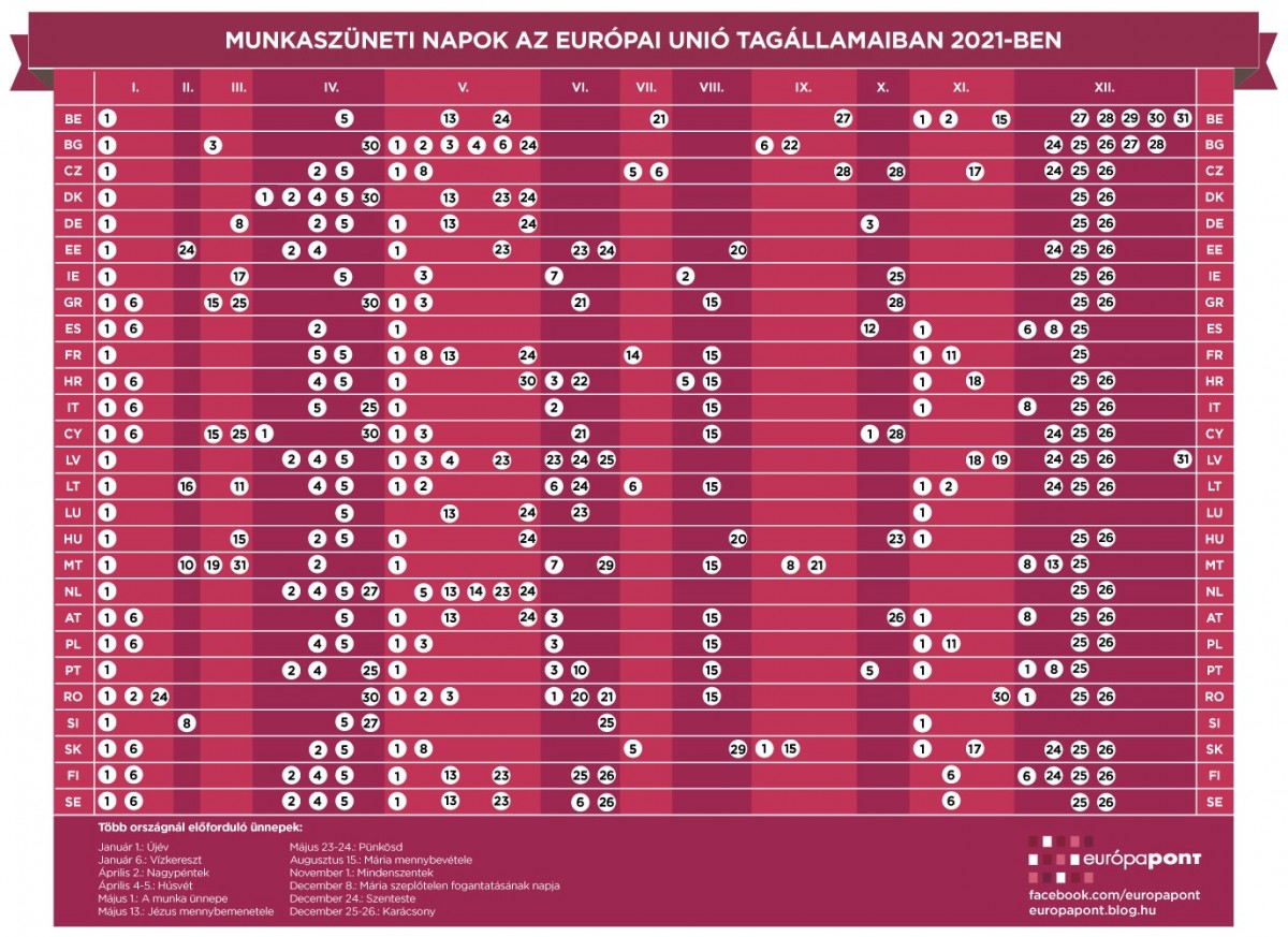 Az alábbi táblázatban áttekinthető formában összeszedtük (nagy méretben itt), mely országokban mely napok számítanak munkaszüneti napnak 2021-ban. A grafika a tagállamok által szolgáltatott, EUR-Lexben megjelent adatokon alapul.
