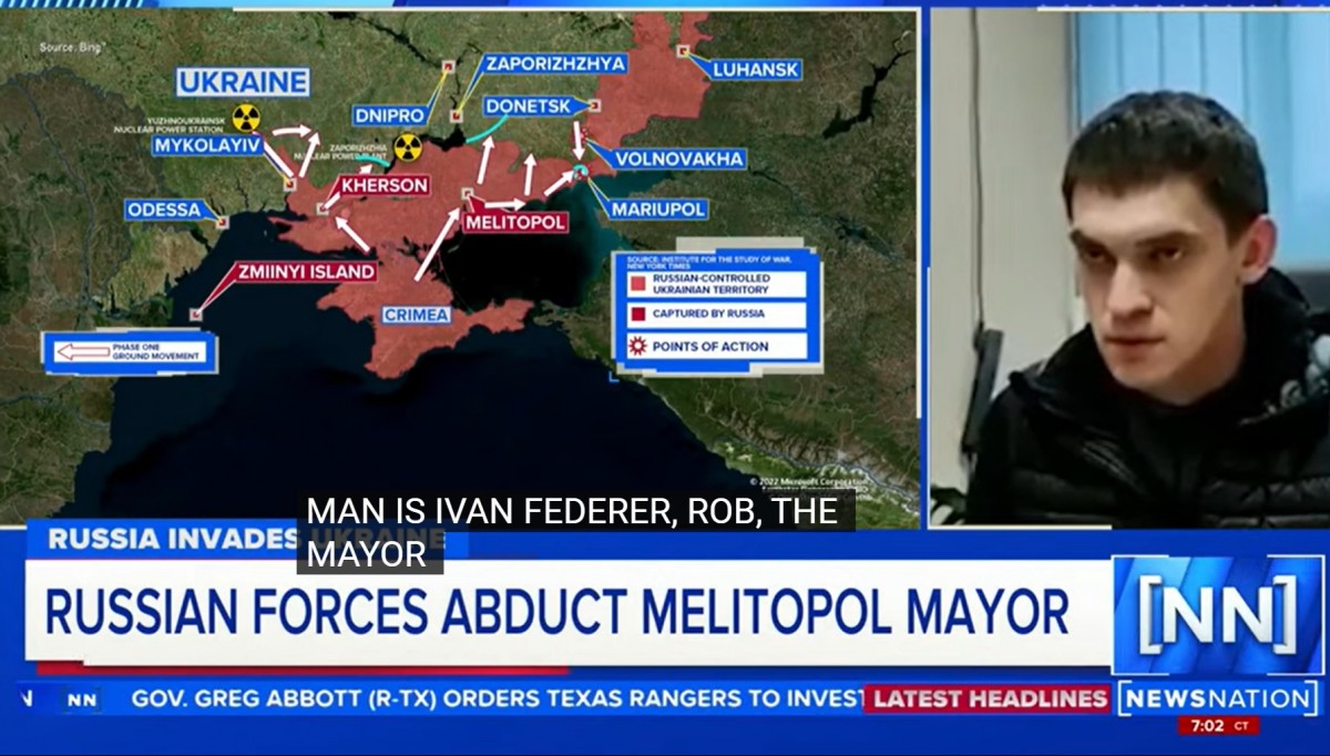 A CNN szerint az orosz katonai ellenőrzés alatt álló Melitopolban már be is iktatták az új polgármestert, aki Galina Danilcsenko, a város önkormányzatának korábbi tagja. Danilcsenko elmondta: „fő feladata, hogy megtegyen minden szükséges lépést annak érdekében, hogy a város visszatérjen a normális kerékvágásba.” Azt állította, hogy még mindig vannak olyan emberek Melitopolban, akik megpróbálják destabilizálni „a helyzetet és kiprovokálni a rossz reakciót.” „Arra kérem önöket, hogy őrizzék meg a józanságukat, és ne üljenek fel ezeknek a provokációknak”