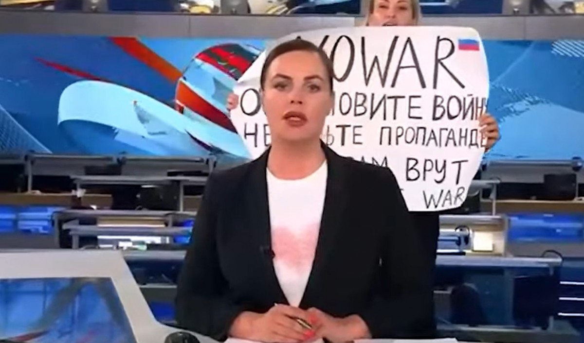 A tüntető az egyik szerkesztő, Marina Ovszjannikova lehetett, akit úgy tudni, őrizetbe vettek és kihallgatnak. A nő korábban azt üzente közösségi oldalán, hogy az apja ukrán, és szégyelli, hogy éveken át a propagandának dolgozott.