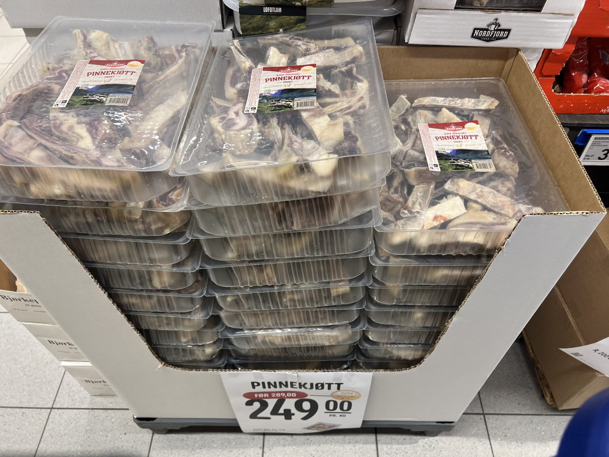 Az ünnepi báránybordájuk (pinnekjøtt) jól szemlélteti ezt a hagyományt. Ez gyakorlatilag sózott, szárított csont némi bárányhússal, amelyet több mint harminc órás áztatás után nyírfaágakon vagy rácson gőzölnek, majd rutabagával (magyarul karórépapürével) és mustárral fogyasztanak. Ez főleg az ország nyugati részén a legelterjedtebb, de Oslóban is kapható, kifejezetten nagy mennyiségben.